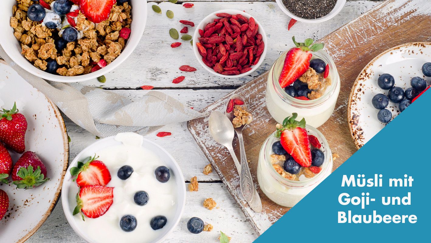 Zubereitung: ein paar Esslöffel guter Müslimischung mit Blaubeeren, ganzen Haselnüssen und Goji-Beeren bestreuen, zum Schluss Milch oder Joghurt darüber. Fertig ist eine echte Power-Mahlzeit. Goji-Beeren bekommt man mittlerweile auch in Supermärkten, auf jeden Fall aber im Bioladen.