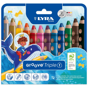 Neben einem Skizzenblock benötigt Ihr Kind natürlich Stifte. Ein Starterset ist das GROOVE Triple 1 Kartonetui von Lyra. Hier werden gleich drei verschiedene Stiftarten in einem Stift kombiniert: Der Aquarellstift, die Wachsmalkreide und der Farbstift. Die Mine der Stifte hat einen Durchmesser von zehn Millimetern und ist sehr resistent, bruchsicher und haltbar. Die pigmentintensiven Farben der zwölf Zentimeter langen Buntstifte sind beim Malen leicht aufzutragen. Die Farbstifte besitzen geschlossene Stiftenden und liegen sehr gut in kleinen Kinderhänden. Hierfür sind an den Seiten rutschfeste Griffmulden für den Daumen, den Zeigefinger und den Mittelfinger angebracht. So wird garantiert, dass Ihr Kind die Stifte gut greifen kann, auch nachdem sie schon einige Male angespitzt wurden. Die Buntstifte sind für alle kleinen Künstler geeignet, unabhängig davon, ob sie Links- oder Rechtshänder sind.