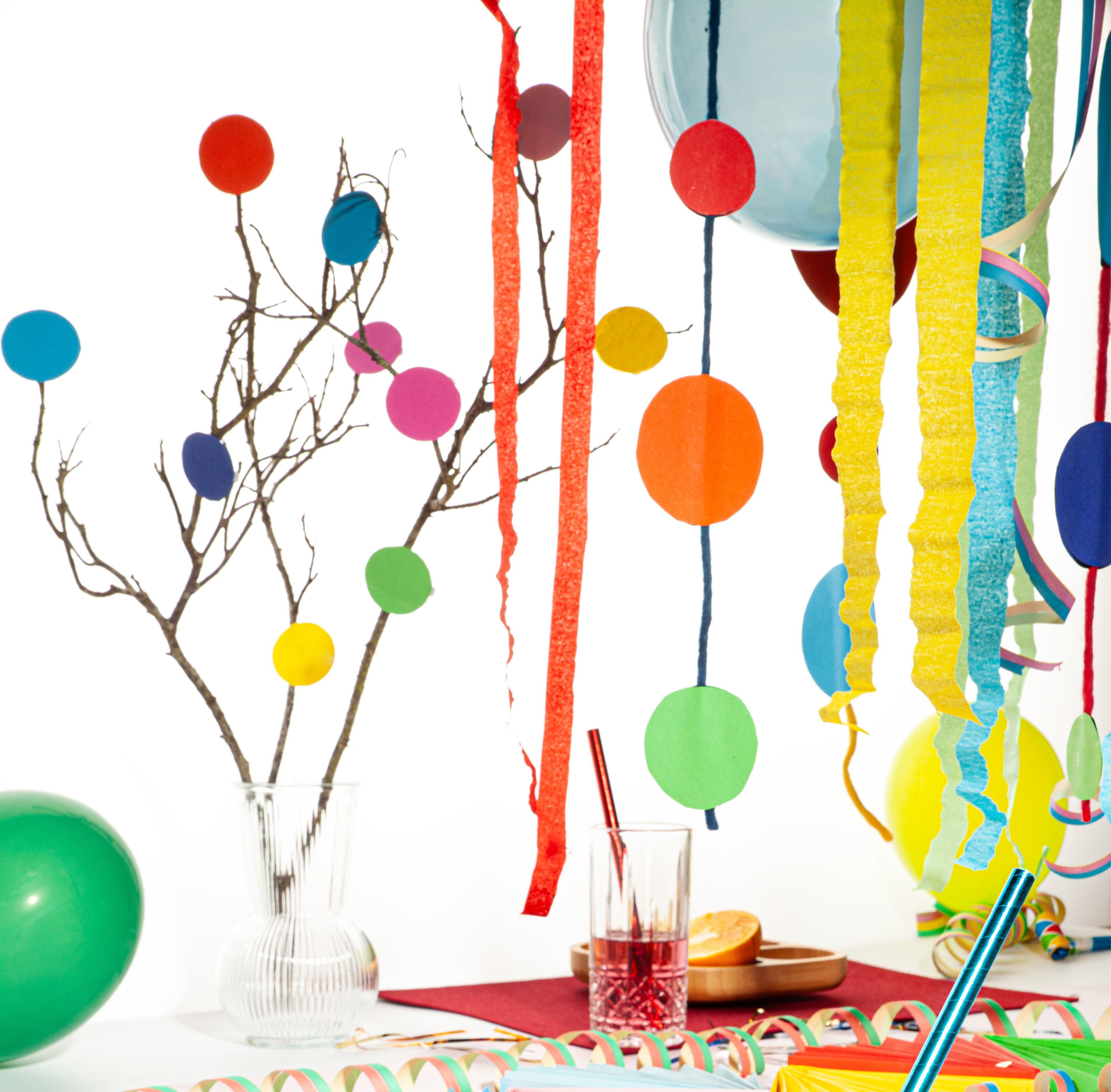 Dieses süße Arragement ist eine originelle Alternative zu Blumen in der Vase. Die leuchtenden Kreise wirken wie kleine Blüten und bringen Farbe auf euren Party-Tisch. Ihr könnt die Größe der Kreise nach euren Wünschen variieren – so wird die Dekoration genau so, wie sie euch gefällt