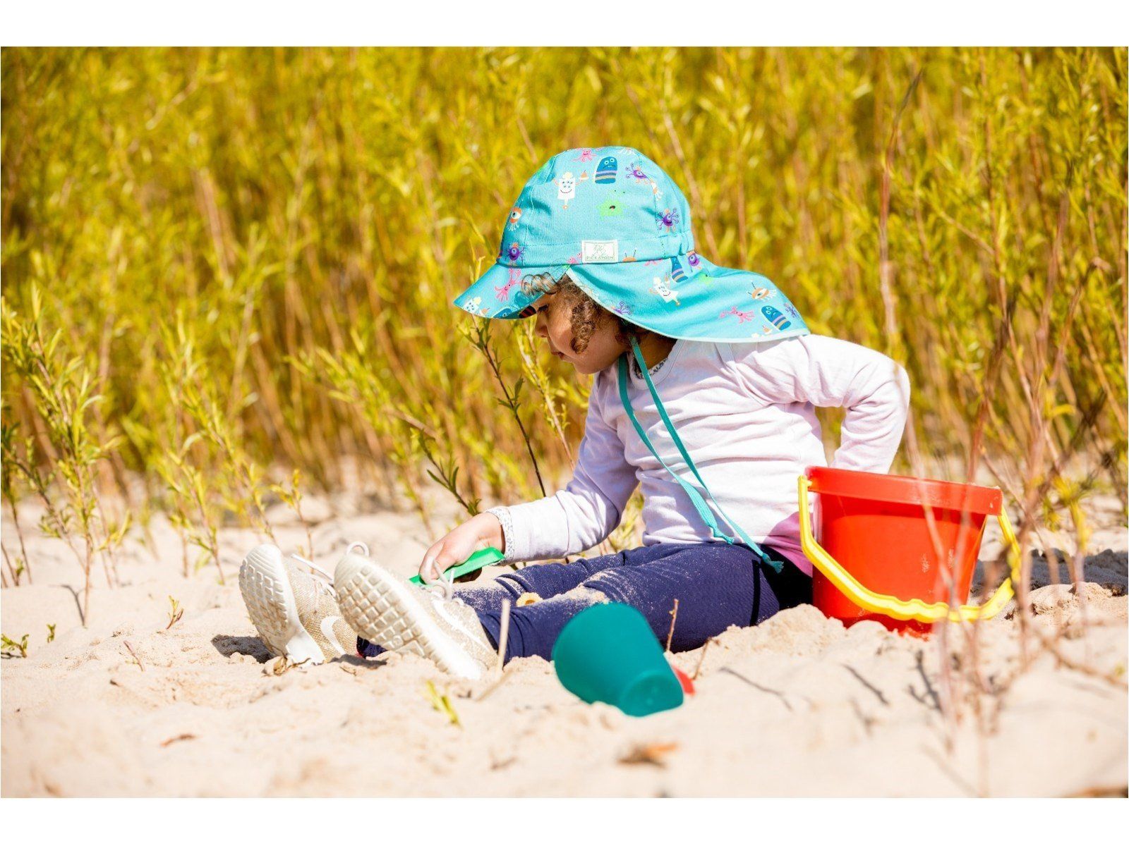 Ökologische Aspekte treffen auf modernes Design und Funktionalität: Ein breiter Schirm und Nackenschutz schützen zuverlässig vor gefährlicher UV-Strahlung. Gesicht, Nacken und Ohren werden selbst beim Toben und Herumlaufen mithilfe von Gummizügen im Nackenbereich sicher geschützt. Zusätzliche Bindebänder bieten einen guten Sitz, einwandfreien Halt und sorgen dafür, dass alles an Ort und Stelle bleibt und die Kopfbedeckung nicht verrutscht – ideal auch für einen Strandtag oder an besonders windigen Tagen. Dabei ist das angenehm softe Material wunderbar anschmiegsam, beengt die Babys und Kinder nicht und gewährleistet optimale Luftzirkulation bei wärmeren Temperaturen. Umweltfreundliche Materialien machen die Mützen zudem äußerst hautverträglich – die Stoffe sind nicht nur sehr weich für die empfindliche Haut deines Kindes, sondern auch völlig frei von umweltbelastenden und hautreizenden Chemikalien.